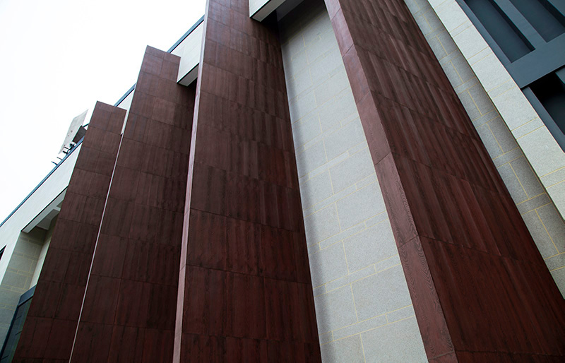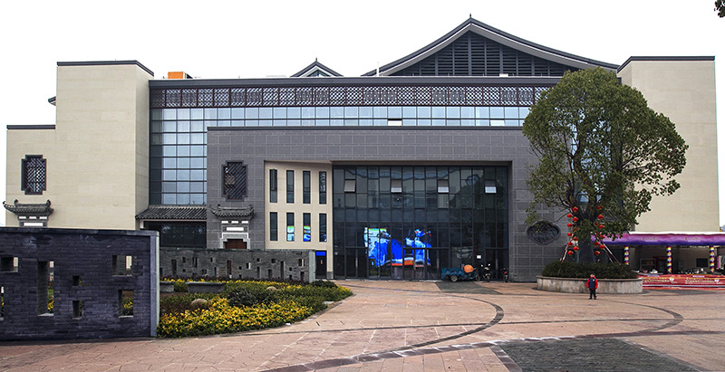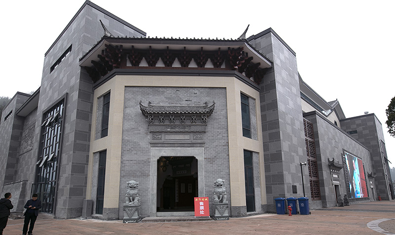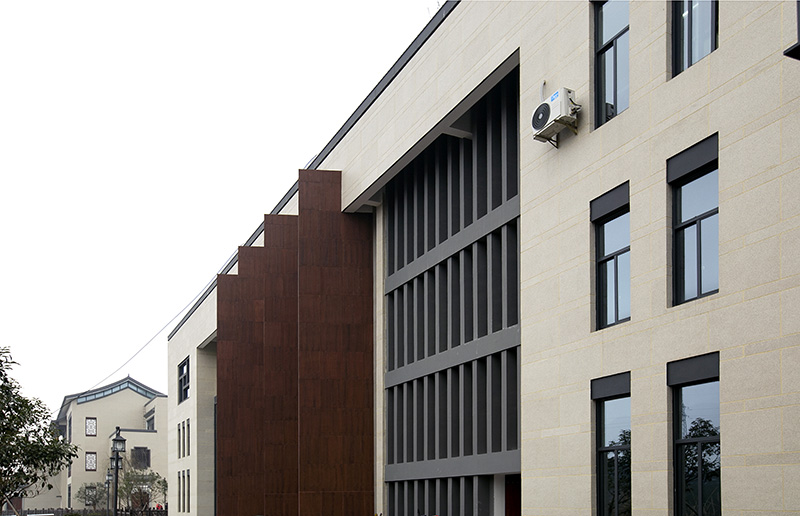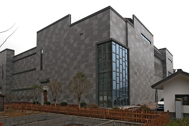 以淺米色花崗巖貼片為主體,正面清灰板巖深淺混搭,完美勾繪出千島湖明清時代深墻大院的風(fēng)韻。